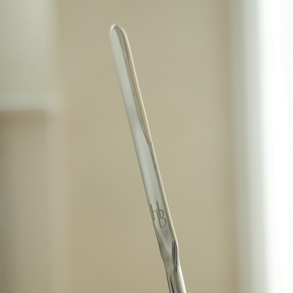 Made from stainless steel, this spatula is designed to provide a seamless, second-skin effect. It ensures flawless coverage without caking or piling, making your base makeup effortless. The spatula's longer edge allows for effortless spreading, while its ergonomic design with a rounded top and tapered end ensures seamless application without harsh lines.